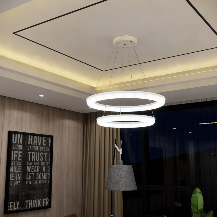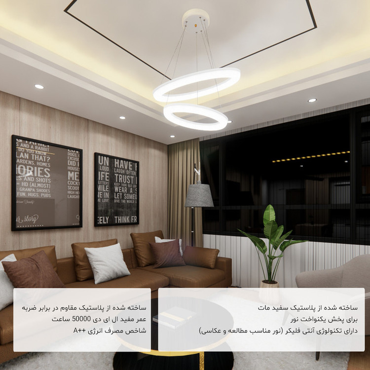 این لوستر علاوه بر داشتن کنترل فیزیکی، قابلیت اتصال و کنترل توسط گوشی هوشمند اندروید را دارد. این لوستر با فناوری ال ای دی سه رنگ می تواند محیط را به رنگ های سفید مهتابی ، زرد آفتابی و نور طبیعی (مخلوط مهتابی و آفتابی) روشن کند. براحتی با هر بار خاموش و روشن کردن رنگ نور تغییر می کند همچنین با خاموش و روشن کردن میتوان شدت نور را کم و زیاد کرد. به این صورت که نور سفید 3500 لومن، نور آفتابی 3500 لومن و نورطبیعی 7000 لومن نور تولید می کند و برای اتاق و سالن های بزرگ تا ابعاد 35 متری مناسب است. کنترل این لوستر دارای حالت های مختلفی از جمله حالت شب خواب است که با فشار یک دکمه نور به پایین ترین حد خود رفته که تنها 2 وات مصرف می کند. این لوستر نیازی به لامپ ندارد. داخل حلقه ی آن، ال ای دی 80 وات با شاخص مصرف انرژی A++ نصب شده است. لامپهای ال ای دی به مراتب از لامپهای کممصرف و رشتهای مصرف کمتری دارند و به همان میزان نور تولید می کنند این لوستر می تواند نوری به اندازه یک لامپ کم مصرف 200 وات تولید کند. بدلیل سیستم خنک کاری مناسب، ال ای دی های این لوستر 25000 ساعت عمر مفید دارند پره های این لوستر از نوعی پلاستیک مات با فرمولاسیون خاص ساخته شده است با این هدف که نور بصورت نرم و کاملا یکنواخت پخش شود. بر خلاف لامپ های ال ای دی که نور تیز و زننده دارند، نور این لوستر بسیار نرم است بطوریکه در حداکثر شدت نور می توانید به آن نگاه کنید بدون آنکه چشم را اذیت کند. اگر یک لامپ کوچک را برای روشنایی یک اتاق در نظر بگیریم بدلیل اینکه منبع نور کوچکی است سایه های زیاد و تیزی در کنار اجسام خواهیم داشت که این کنتراست شدید نور، به سرعت چشم ها را خسته می کند. در این لوستر بدلیل اینکه از تمام سطح حلقه نور یکنواخت تابیده می شود منبع نوری بزرگی ایجاد می شود که سایه های کم و بسیار نرم و نامحسوسی خواهیم داشت. با تکنولوژِی جدید آنتی فلیکر، پخش نور در این لوستر کاملا بدون فلیک یا بدون چشمک می باشد. این تکنولوژی مخصوص مطالعه و عکاسی می باشد. درهنگام مطالعه به هیچ وجه چشم را خسته نمی کند و در هنگام عکاسی در تصویر دوربین موج ایجاد نمی کند. ارتفاع این لوستر قابل تنظیم می باشد و همچنین می توانید آن را زاویه دار تنظیم کنید.