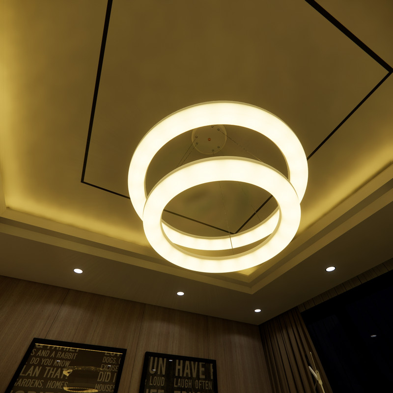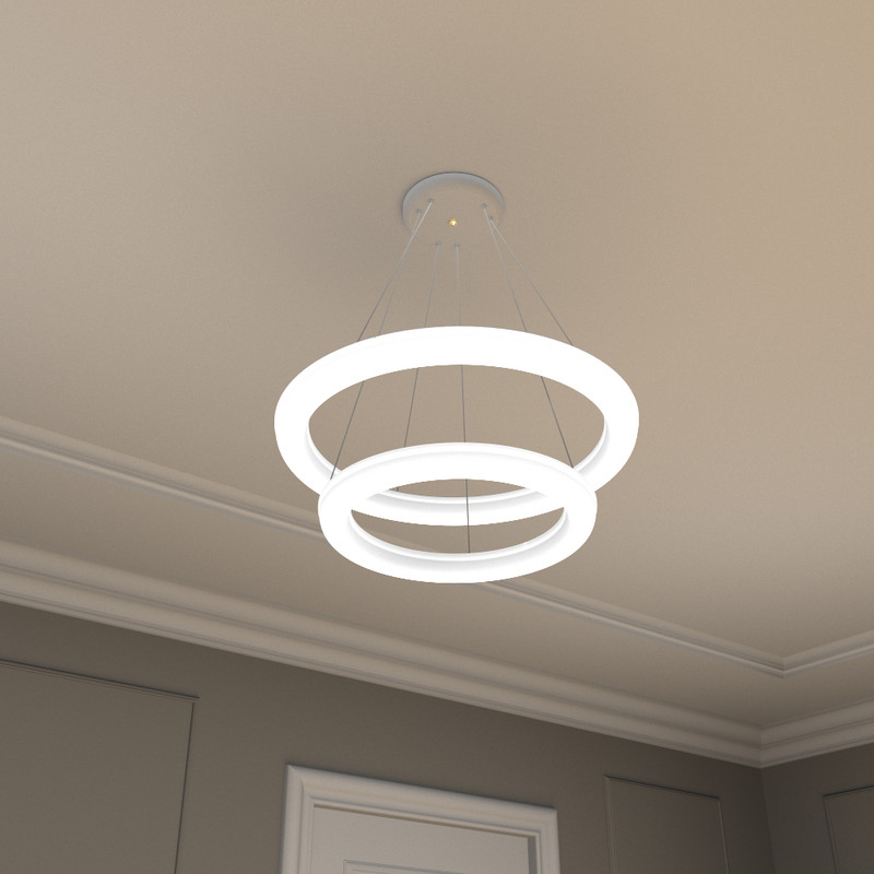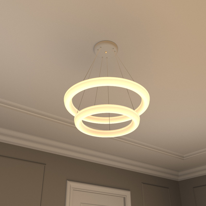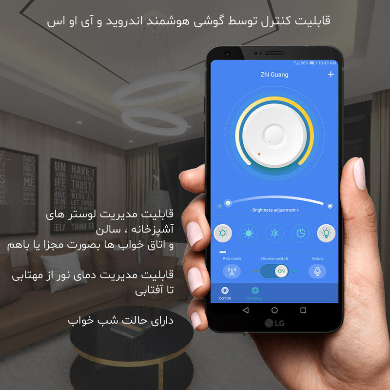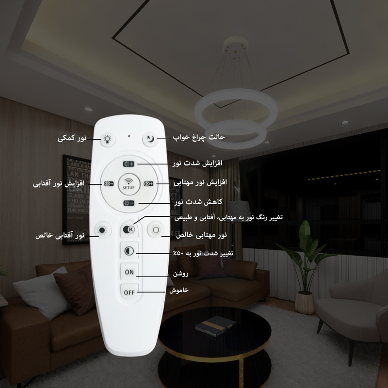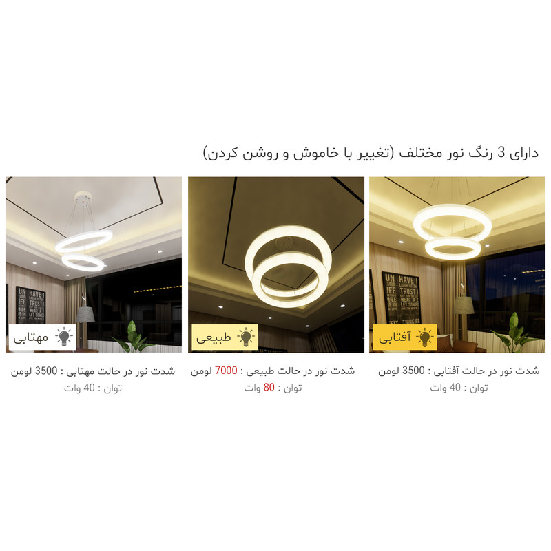 این لوستر علاوه بر داشتن کنترل فیزیکی، قابلیت اتصال و کنترل توسط گوشی هوشمند اندروید را دارد. این لوستر با فناوری ال ای دی سه رنگ می تواند محیط را به رنگ های سفید مهتابی ، زرد آفتابی و نور طبیعی (مخلوط مهتابی و آفتابی) روشن کند. براحتی با هر بار خاموش و روشن کردن رنگ نور تغییر می کند همچنین با خاموش و روشن کردن میتوان شدت نور را کم و زیاد کرد. به این صورت که نور سفید 3500 لومن، نور آفتابی 3500 لومن و نورطبیعی 7000 لومن نور تولید می کند و برای اتاق و سالن های بزرگ تا ابعاد 35 متری مناسب است. کنترل این لوستر دارای حالت های مختلفی از جمله حالت شب خواب است که با فشار یک دکمه نور به پایین ترین حد خود رفته که تنها 2 وات مصرف می کند. این لوستر نیازی به لامپ ندارد. داخل حلقه ی آن، ال ای دی 80 وات با شاخص مصرف انرژی A++ نصب شده است. لامپهای ال ای دی به مراتب از لامپهای کممصرف و رشتهای مصرف کمتری دارند و به همان میزان نور تولید می کنند این لوستر می تواند نوری به اندازه یک لامپ کم مصرف 200 وات تولید کند. بدلیل سیستم خنک کاری مناسب، ال ای دی های این لوستر 25000 ساعت عمر مفید دارند پره های این لوستر از نوعی پلاستیک مات با فرمولاسیون خاص ساخته شده است با این هدف که نور بصورت نرم و کاملا یکنواخت پخش شود. بر خلاف لامپ های ال ای دی که نور تیز و زننده دارند، نور این لوستر بسیار نرم است بطوریکه در حداکثر شدت نور می توانید به آن نگاه کنید بدون آنکه چشم را اذیت کند. اگر یک لامپ کوچک را برای روشنایی یک اتاق در نظر بگیریم بدلیل اینکه منبع نور کوچکی است سایه های زیاد و تیزی در کنار اجسام خواهیم داشت که این کنتراست شدید نور، به سرعت چشم ها را خسته می کند. در این لوستر بدلیل اینکه از تمام سطح حلقه نور یکنواخت تابیده می شود منبع نوری بزرگی ایجاد می شود که سایه های کم و بسیار نرم و نامحسوسی خواهیم داشت. با تکنولوژِی جدید آنتی فلیکر، پخش نور در این لوستر کاملا بدون فلیک یا بدون چشمک می باشد. این تکنولوژی مخصوص مطالعه و عکاسی می باشد. درهنگام مطالعه به هیچ وجه چشم را خسته نمی کند و در هنگام عکاسی در تصویر دوربین موج ایجاد نمی کند. ارتفاع این لوستر قابل تنظیم می باشد و همچنین می توانید آن را زاویه دار تنظیم کنید.
