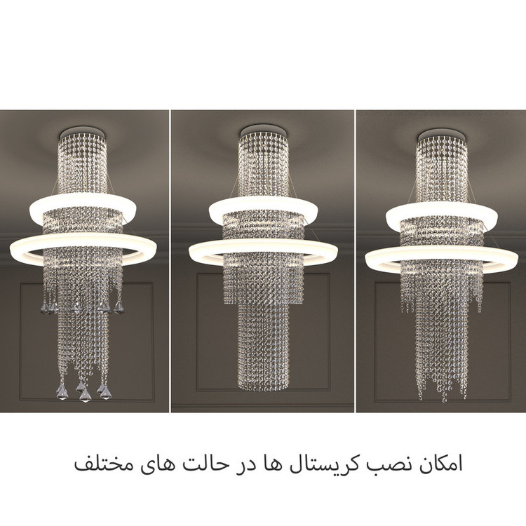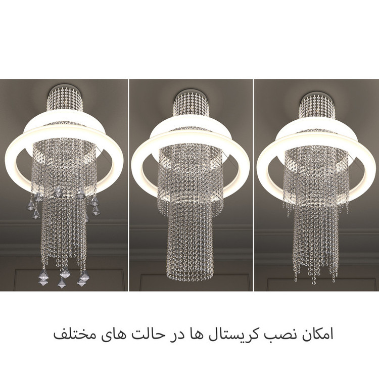 این لوستر علاوه بر داشتن کنترل فیزیکی، قابلیت اتصال و کنترل توسط گوشی هوشمند اندروید را دارد. این لوستر با فناوری ال ای دی سه رنگ می تواند محیط را به رنگ های سفید مهتابی ، زرد آفتابی و نور طبیعی (مخلوط مهتابی و آفتابی) روشن کند. براحتی با هر بار خاموش و روشن کردن رنگ نور تغییر می کند همچنین با خاموش و روشن کردن میتوان شدت نور را کم و زیاد کرد. به این صورت که نور سفید 3500 لومن، نور آفتابی 3500 لومن و نورطبیعی 7000 لومن نور تولید می کند و برای اتاق و سالن های متوسط تا ابعاد 35 متری مناسب است. کنترل این لوستر دارای حالت های مختلفی از جمله حالت شب خواب است که با فشار یک دکمه نور به پایین ترین حد خود رفته که تنها 2 وات مصرف می کند. این لوستر نیازی به لامپ ندارد. داخل حلقه های آن، ال ای دی 80 وات با شاخص مصرف انرژی A++ نصب شده است. لامپهای ال ای دی به مراتب از لامپهای کممصرف و رشتهای مصرف کمتری دارند و به همان میزان نور تولید می کنند این لوستر می تواند نوری به اندازه یک لامپ کم مصرف 200 وات تولید کند. بدلیل سیستم خنک کاری مناسب، ال ای دی های این لوستر 25000 ساعت عمر مفید دارند پره های این لوستر از نوعی پلاستیک مات با فرمولاسیون خاص ساخته شده است با این هدف که نور بصورت نرم و کاملا یکنواخت پخش شود. بر خلاف لامپ های ال ای دی که نور تیز و زننده دارند، نور این لوستر بسیار نرم است بطوریکه در حداکثر شدت نور می توانید به آن نگاه کنید بدون آنکه چشم را اذیت کند. اگر یک لامپ کوچک را برای روشنایی یک اتاق در نظر بگیریم بدلیل اینکه منبع نور کوچکی است سایه های زیاد و تیزی در کنار اجسام خواهیم داشت که این کنتراست شدید نور، به سرعت چشم ها را خسته می کند. در این لوستر بدلیل اینکه از تمام سطح حلقه ها نور یکنواخت تابیده می شود منبع نوری بزرگی ایجاد می شود که سایه های کم و بسیار نرم و نامحسوسی خواهیم داشت. با تکنولوژِی جدید آنتی فلیکر، پخش نور در این لوستر کاملا بدون فلیک یا بدون چشمک می باشد. این تکنولوژی مخصوص مطالعه و عکاسی می باشد. درهنگام مطالعه به هیچ وجه چشم را خسته نمی کند و در هنگام عکاسی در تصویر دوربین موج ایجاد نمی کند. چیدمان ریسه های کریستال را می توانید در هنگام نصب تغییر دهید. در تصاویر این محصول 3 مدل آرایش مختلف ریسه ها را مشاهده می کنید.