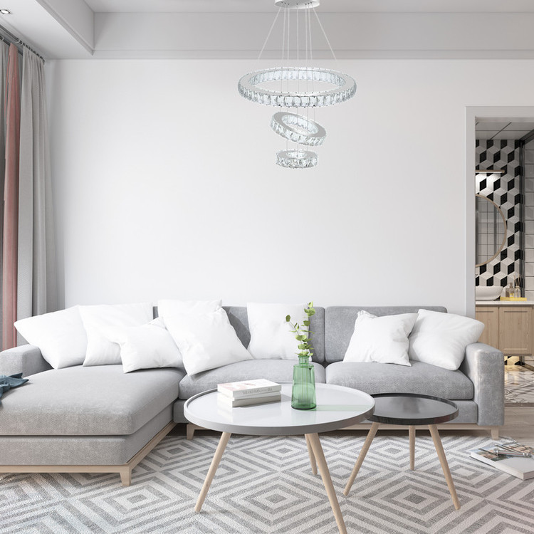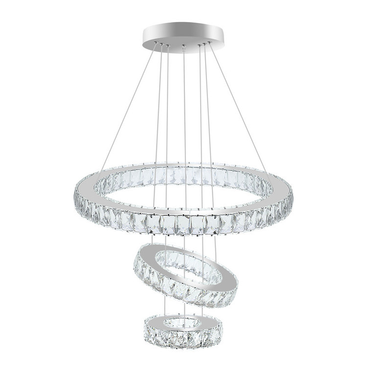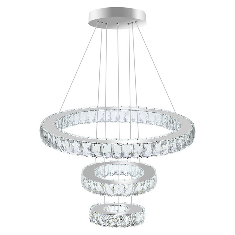 لوستر مدرن 3 حلقه ای دایره کریستال با قطرهای 50,30,15 سانتیمتر متشکل از سوپر کریستال 5×3 سانتیمتر جنس بدنه ضد زنگ و ضد رطوبت دارای 3 حالت نور: مهتابی،آفتابی،ترکیبی و امکان تنظیم شدت نور