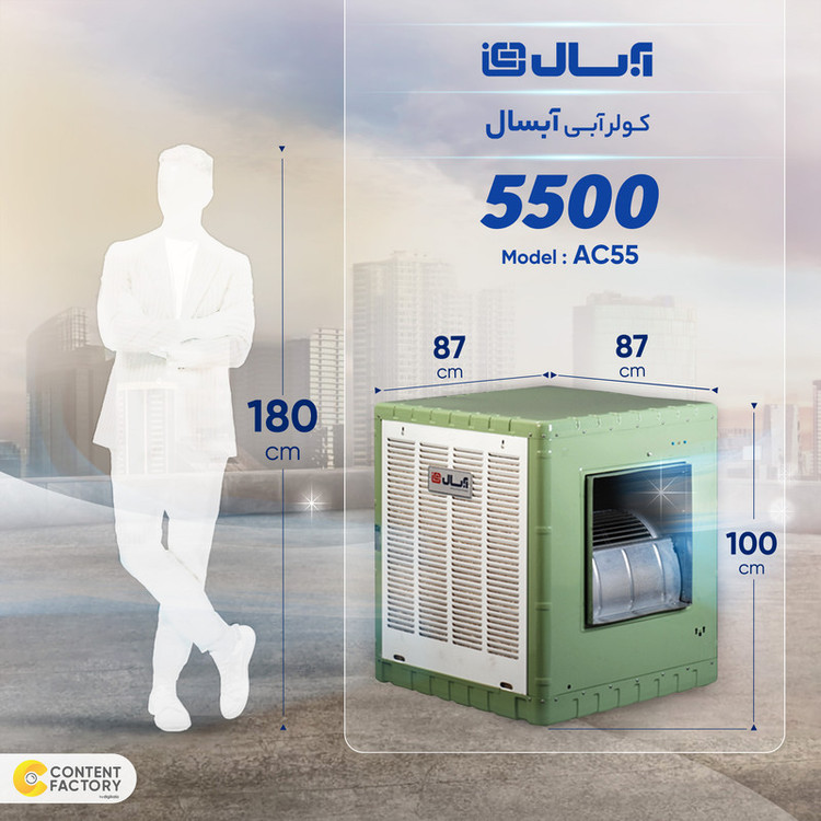کولر آبی 5500 آبسال مدل AC55با ابعاد 100 × 87 × 87 سانتیمتر و وزن خالص 67 کیلوگرم، از جنس گالوانیزه ساخته شده است که نتیجه میشود، بدنه آن مقاوم و دارای طول عمر بالاست. حجم کولر این محصول 5500 CFM است، که باعث میشود تا حجم زیادی از هوای خنک را وارد خانه کند. سطح مصرف انرژی در این محصول، گرید D را به خود اختصاص داده که تقریبا میتوان گفت مصرف انرژی در این محصول بهینه نیست. بنابراین جهت صرفه جویی در مصرف انرژی لازم است برای مدت طولانی از این دستگاه استفاده نکنید. و بعد از چند ساعت روشن کردن، آن را خاموش کنید. کولر آبی 5500 آبسال مدل AC55برای خنک کردن متراژهایی بین 70 تا 120 متر مربع مناسب است. همچنین، حداکثر قدرت باد دهی آن 6650 متر مکعب در ساعت است که میتواند محیط را به خوبی خنک کند. کولر دارای قدرت پمپ 1.60 اسب بخار و قدرت موتور 1/2 اسب بخار است که برای یک کولر خانگی قدرت قابل قبول است. کولر آبی 5500 آبسال مدل AC55 مجهز به کلید محافظ جان است که امنیت کاربر را تضمین میکند. پروانهی یکپارچه آن بدون لرزش و صدا است و بالانس شده با دستگاههای تمام خودکار است که موجب دوام بیشتر یاتاقان و کولر میشود. دیگر ویژگیهای این کولر شامل امکان تنظیم دقیق و تقسیم یکنواخت آب روی پوشالهاست که منجر به افزایش راندمان و خنکی کولر میشود و همچنین مانع از ریختن آب روی الکتروموتور و سوختن آن میگردد. بدنه این کولر آبی از ورق گالوانیزه مرغوب با پوشش ضخیمی از رنگ پودری الکترواستاتیکی ساخته شده که موجب دوام و مقاومت در برابر خرابیها میشود. این کولر همچنین دارای کلید الکترونیکی است که به کاربر امکان استفادهی آسانتر از دستگاه را میدهد.